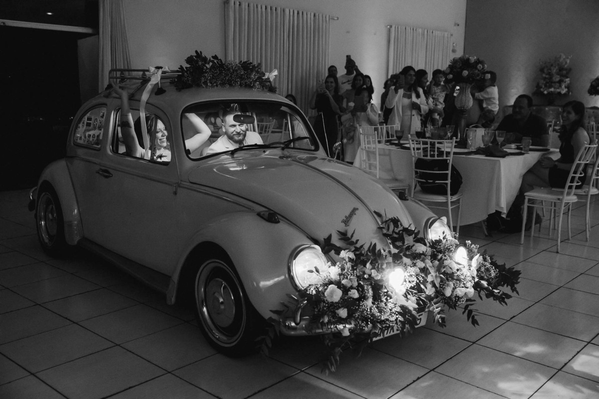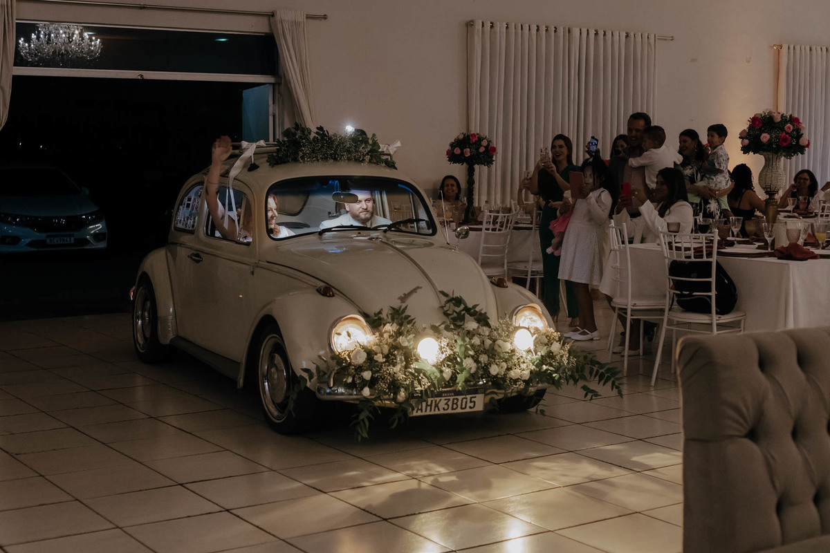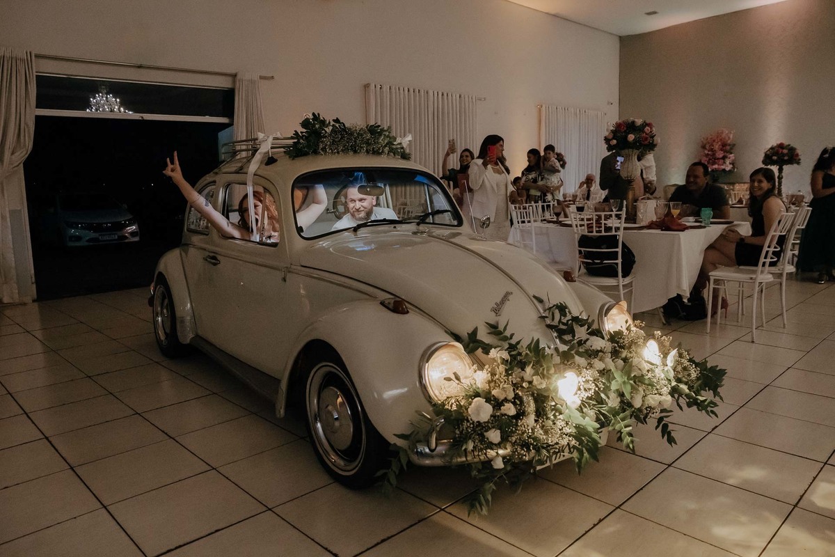 Outra participação especial foi a do fusquinha do tio Luiz, que bombou muito! Ele estava todo enfeitado, e depois de usarmos para umas fotinhas do casal, foi o veículo de entrada no salão de festa e ainda usado como cabine fotográfica dos convidados! Eu disse que bombou pô!
